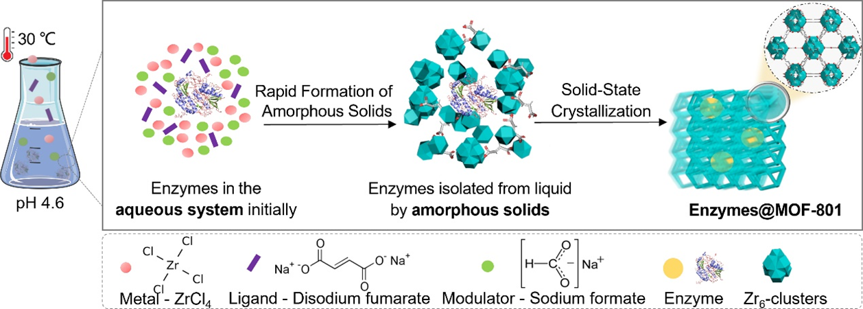 酶在工业制造领域有着广泛应用潜力,但其对极端环境(如高温、强酸或有机溶剂)非常敏感,容易在非优化条件下发生结构损伤。金属有机框架(MOFs)作为酶固定化的载体,可显著提升酶的稳定性。其中,锆基MOFs具有卓越的热、机械和化学稳定性,是酶固定化载体的优秀候选材料。传统的锆基 MOFs合成方法通常需在苛刻的溶剂热条件下进行,如高温、有机溶剂及强酸性环境,极易造成酶的不可逆失活。因此,将酶直接封装在锆基 MOFs 中极具挑战性。