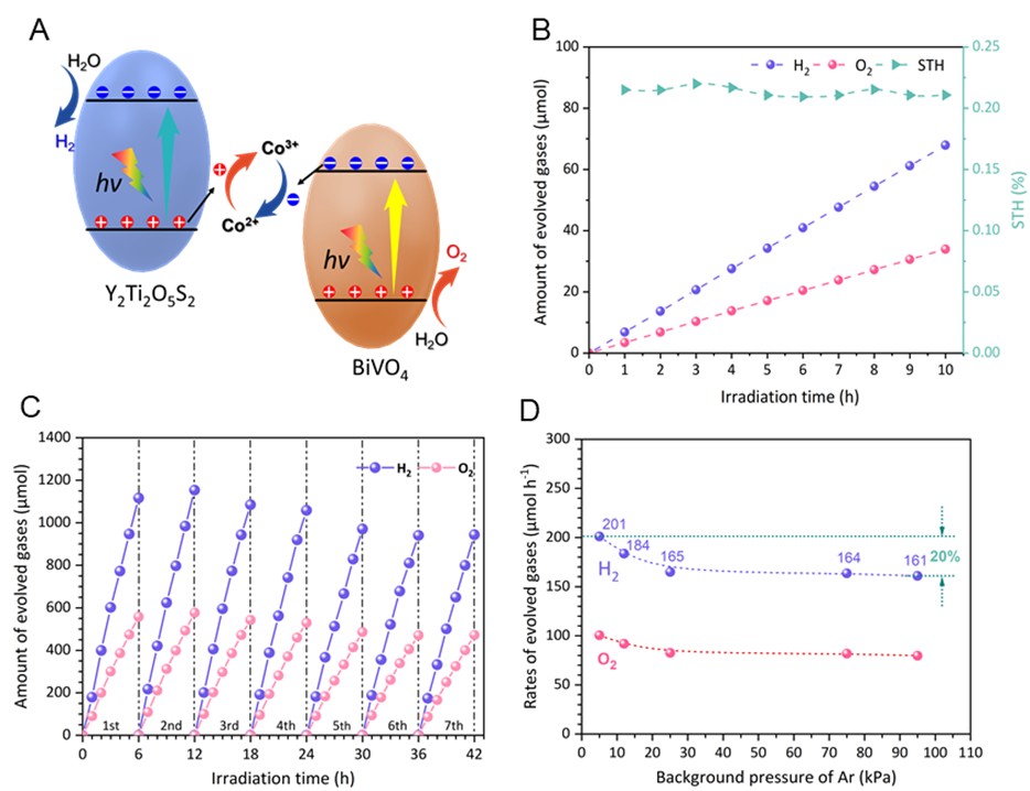 模拟自然光合作用流程,团队以YTOS为产氢光催化剂,以同样具有可见光吸收特性的BiVO4为产氧光催化剂,并引入Co3+/Co2+离子对作为可逆电子介质,构建了可见光驱动下的Z型全分解水反应体系。该体系在AM1.5模拟太阳光以及高强度氙灯光照条件下均表现出稳定的同步产氢、产氧能力。更重要的是,该反应体系对外界压力具有良好的耐受性,这一特性有利于提升光分解水工艺的实际应用潜力。