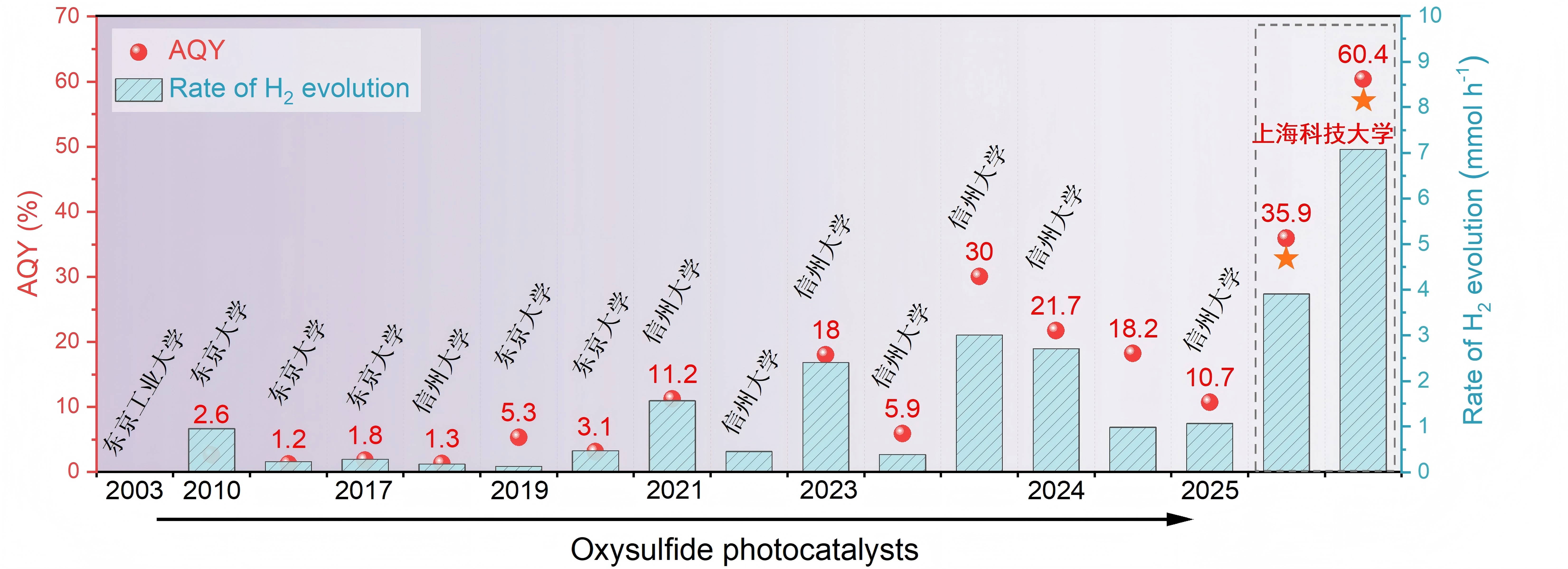 氧硫化物是一类非常有前景的光催化剂材料,但由于在合成条件和活性提升方面的挑战,国内鲜有课题组开展相关研究,以往报道主要以东京大学等日本研究团队为主,经过二十多年的发展,对这一光催化剂材料的研究已进入加速阶段,近几年在活性和机理方面不断取得突破。马贵军团队自2017年起即布局氧硫化物相关研究,近期先后报道了Y2Ti2O5S2Sm2Ti2O5S2催化剂的各向异性电荷传输性质与定向精准活性调控策略,在此基础上,本工作进一步将该类光催化剂产氢的表观量子效率提升到60.4% (@ 420 m),是目前本领域最高活性记录。